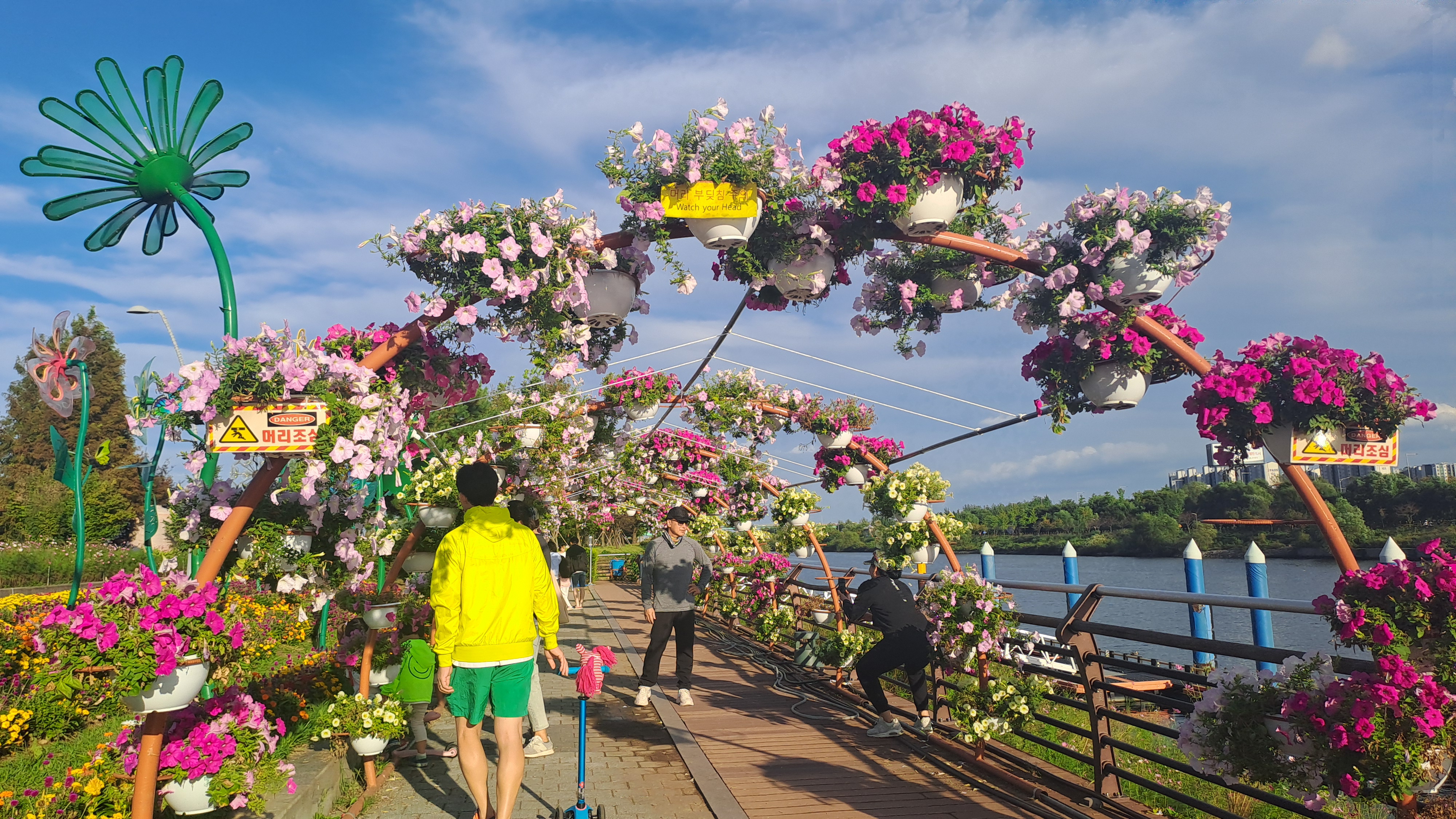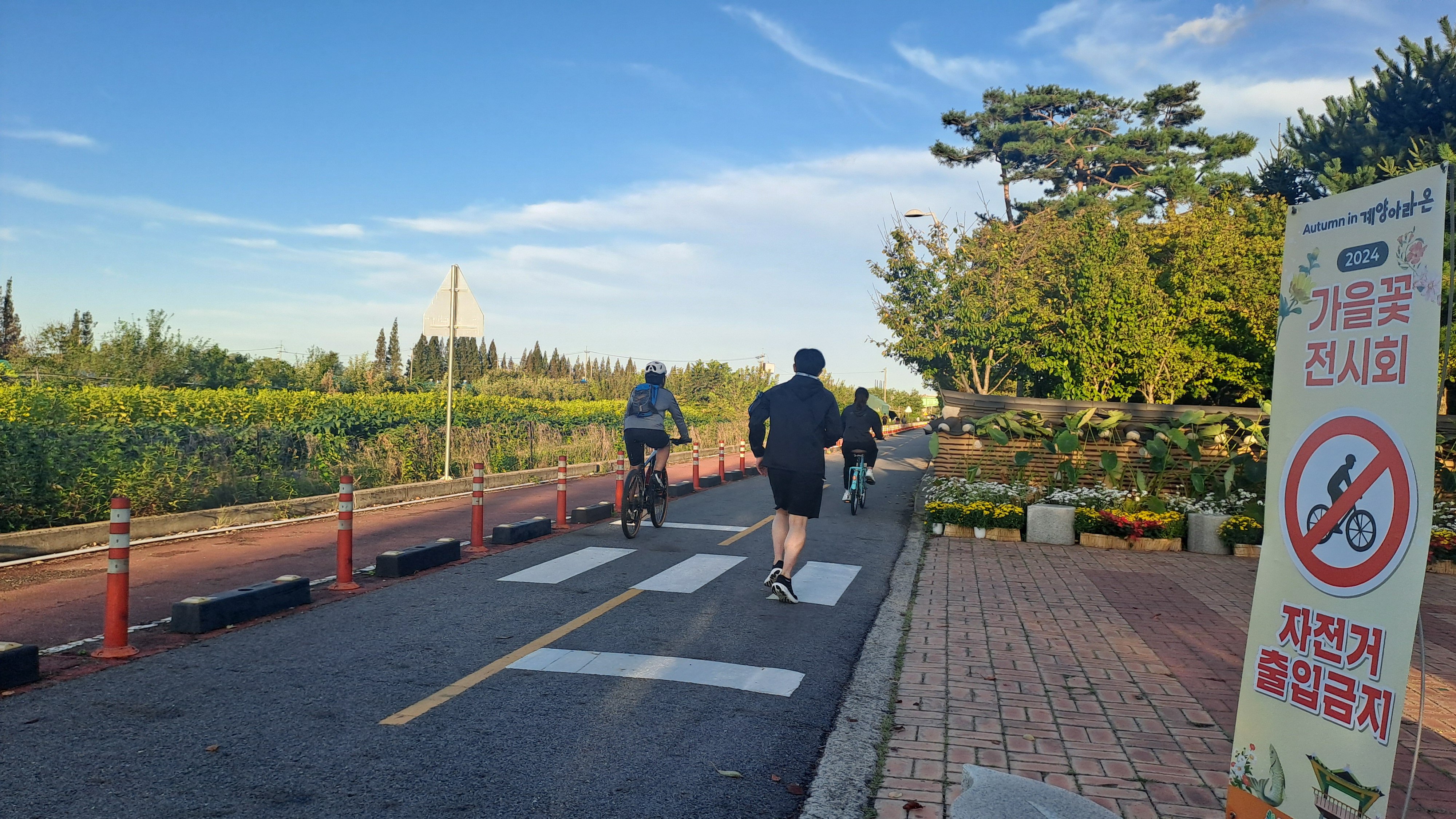 휴일이라 많은 사람들이 자전거와 조깅으로 꽃전시회를 더욱 빛내고 있다